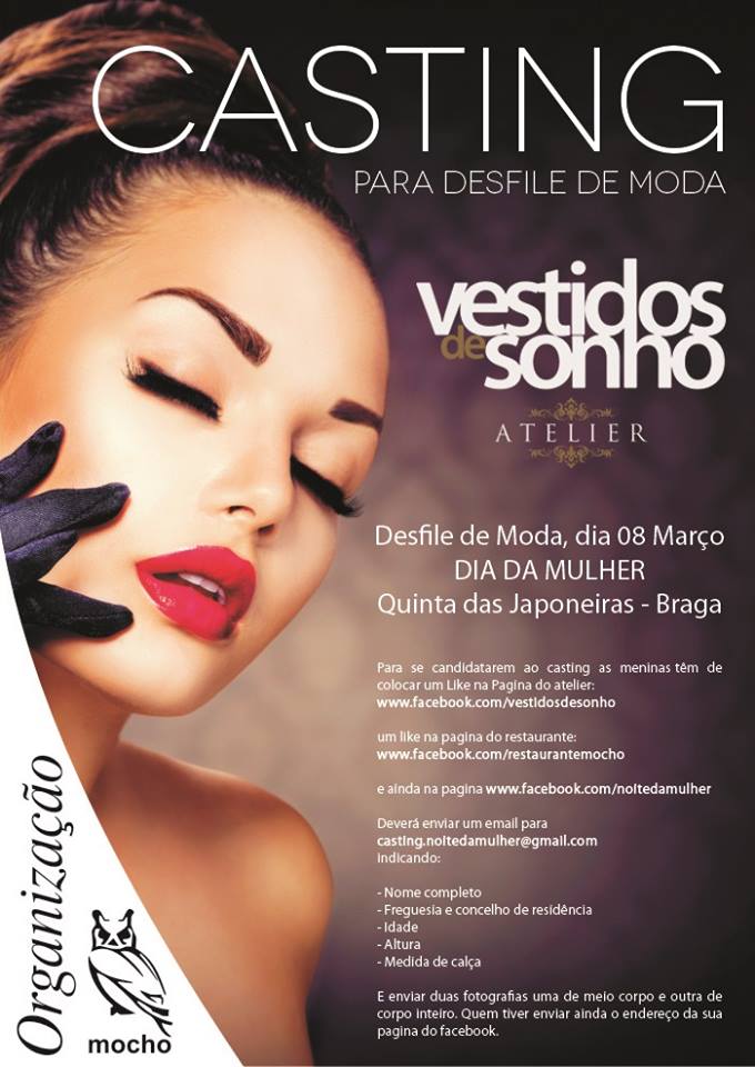 Fica convosco, uma pequenina amostra do casting para o desfile da Vestidos de Sonho, na Quinta da Japoneira este dia 08 de Março, num evento que homenageia todas as mulheres e que tem a chancela do Restaurante Mocho. A todas as meninas que se candidataram desejamos as maiores felicidades e se não foi desta que abriram a porta para o vosso sonho, não desistam. Deliciem-se. Obrigada ao júri convidado Silvia Miranda :: Nobodymodels Helder :: Bento Fotógrafo Pedro Miranda :: B’GLAM Magazine fotografias: Bento Fotógrafo