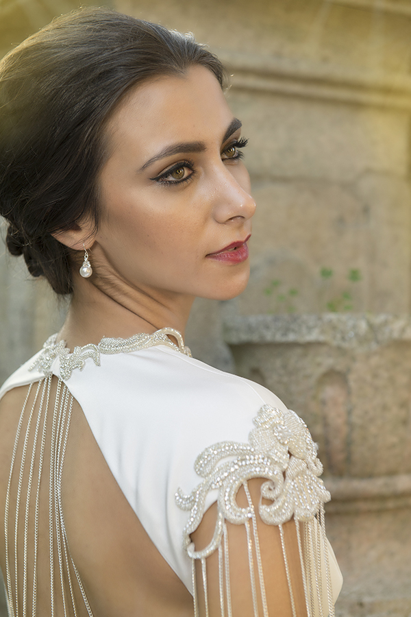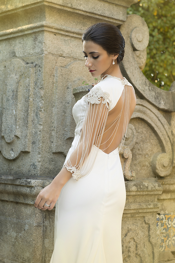 Elegante vestido trabalhado sobre aplicações de mangas e decotes com um cair fluido em crepe.