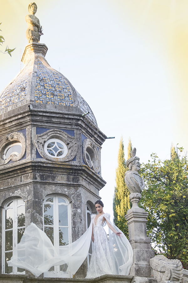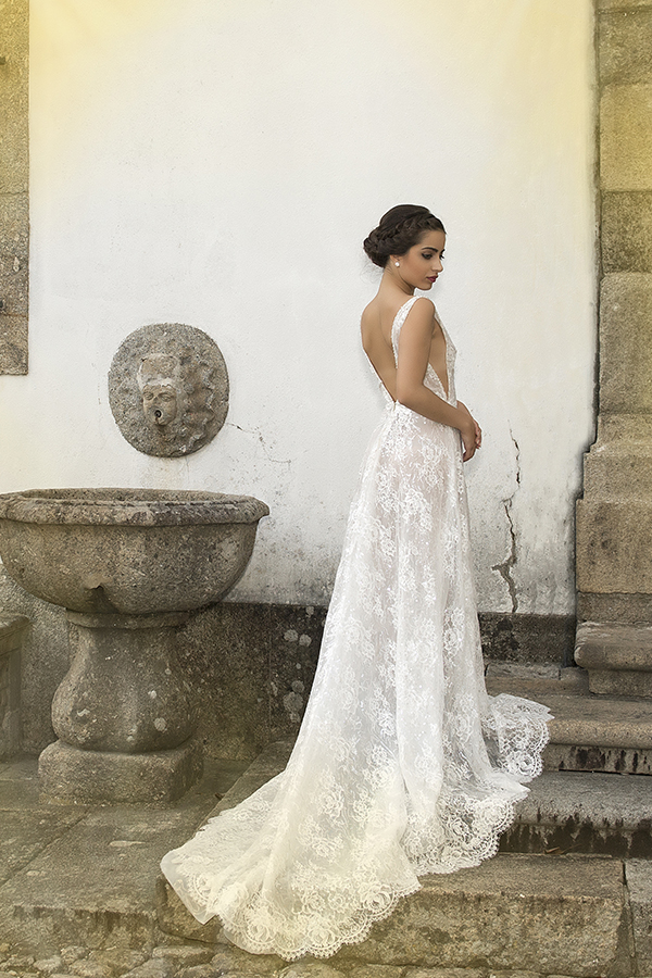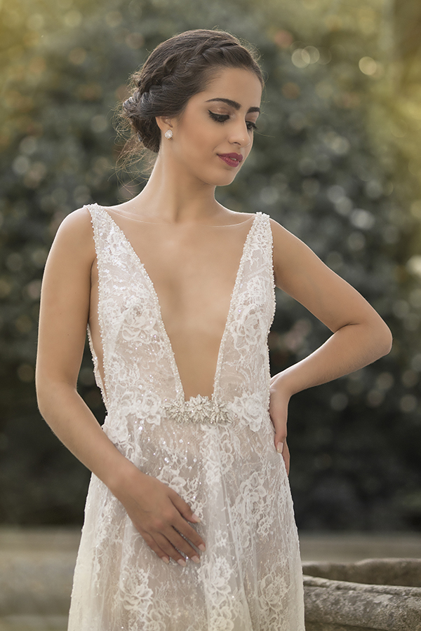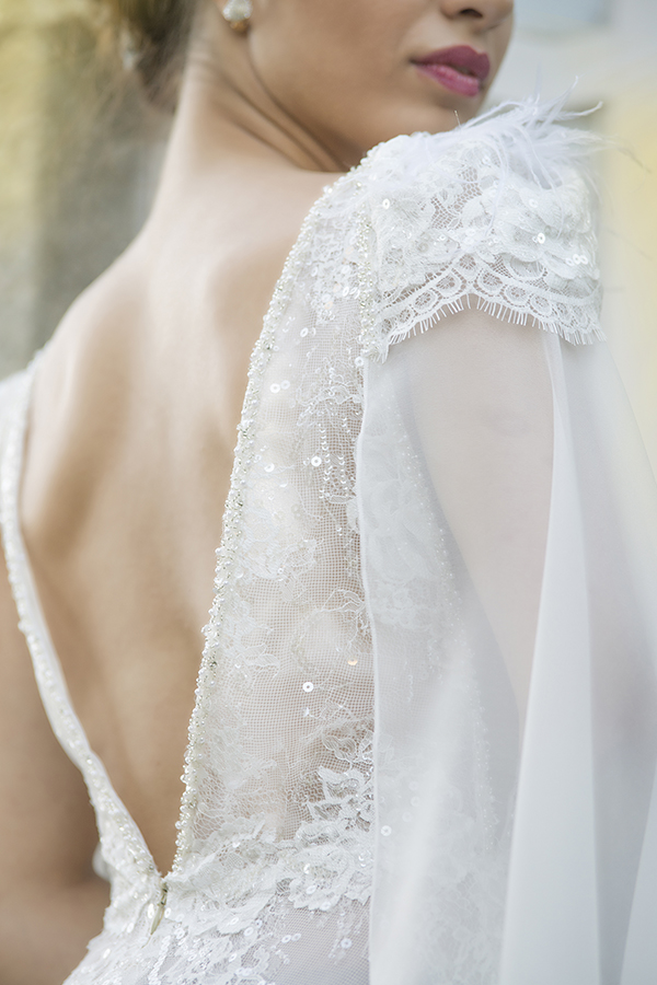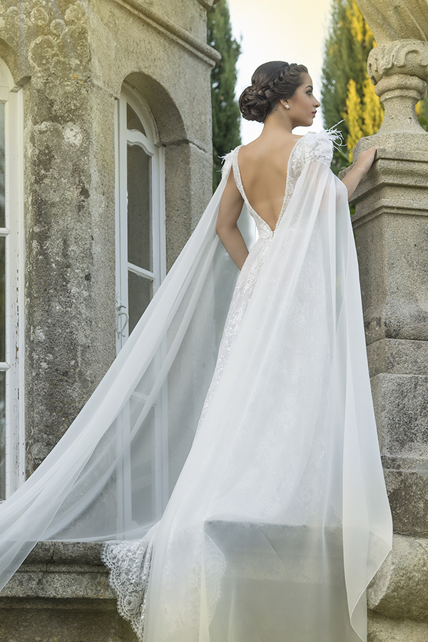 Vestido de noiva fluido feito em renda trabalhada a lantejoula sobre tule. Decotes fundos em V com aplicação de brilho na frente. As mangas amovíveis, permitem dois looks à noiva e quando aplicadas deixam uma cauda imponente ao vestido.