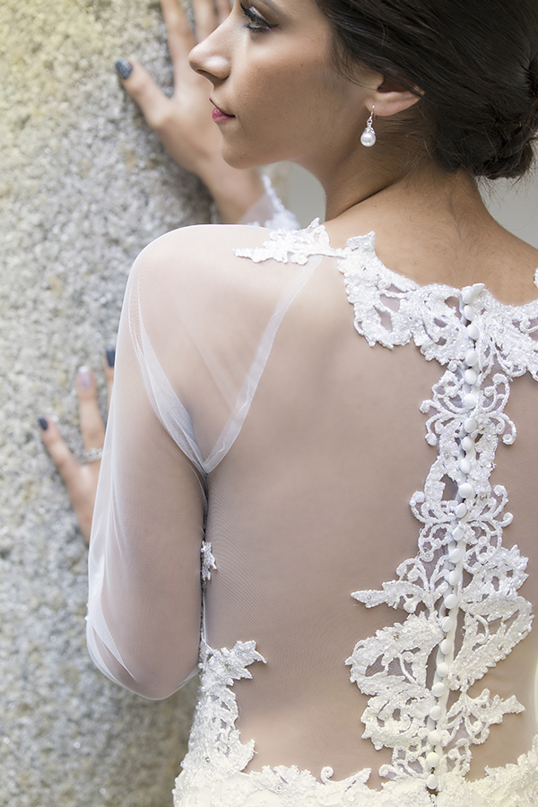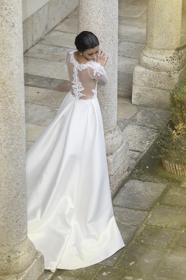 Vestido em mikado com detalhes bordados a rendas. As mangas assim como as costas são trabalhadas em tule. Apresenta uma imponente cauda amovível também feita em mikado.