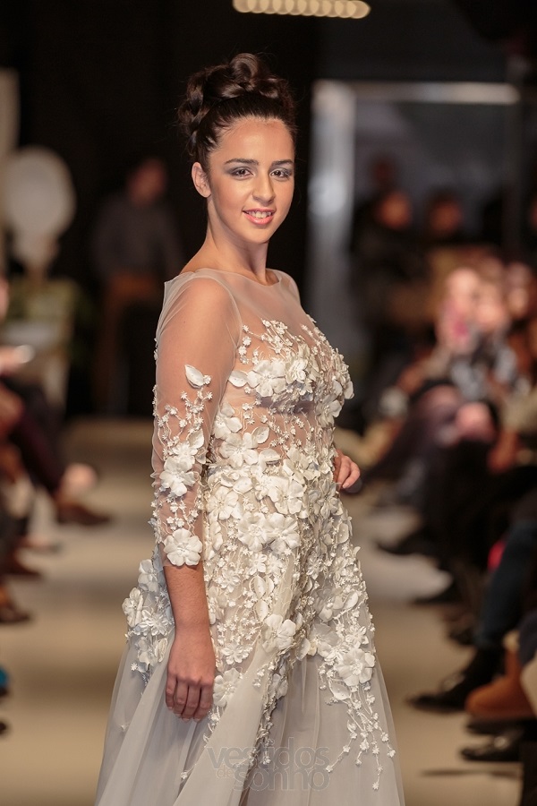 Um vestido leve feito em organza, decote em barco e saia linha A. O que se destaca são as aplicações de flores desde o peito ate aos joelhos e nas mangas. Perfeito para uma noiva que queira um vestido diferente.