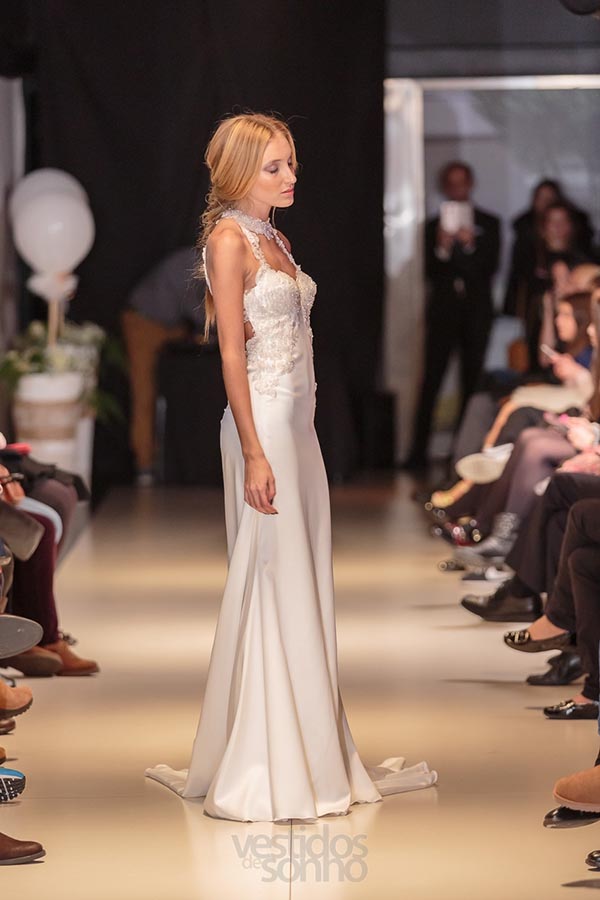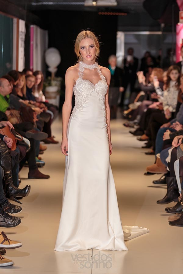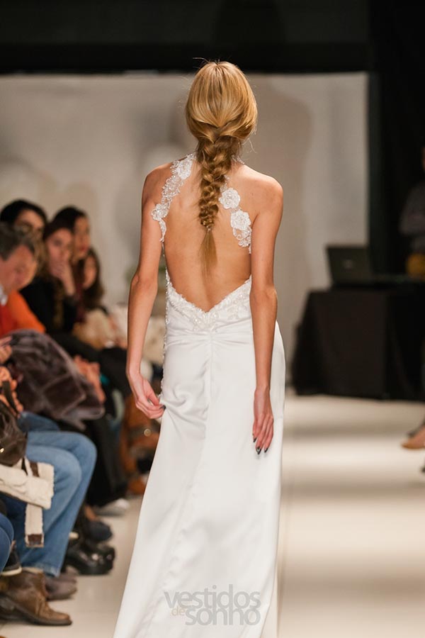 Vestido cauda de sereia, elegante. Decote em coração, com aplicações em renda e com alças em renda e com alças em renda, costa aberta com aplicações em renda florida. Perfeito para acentuar a silhueta da noiva.